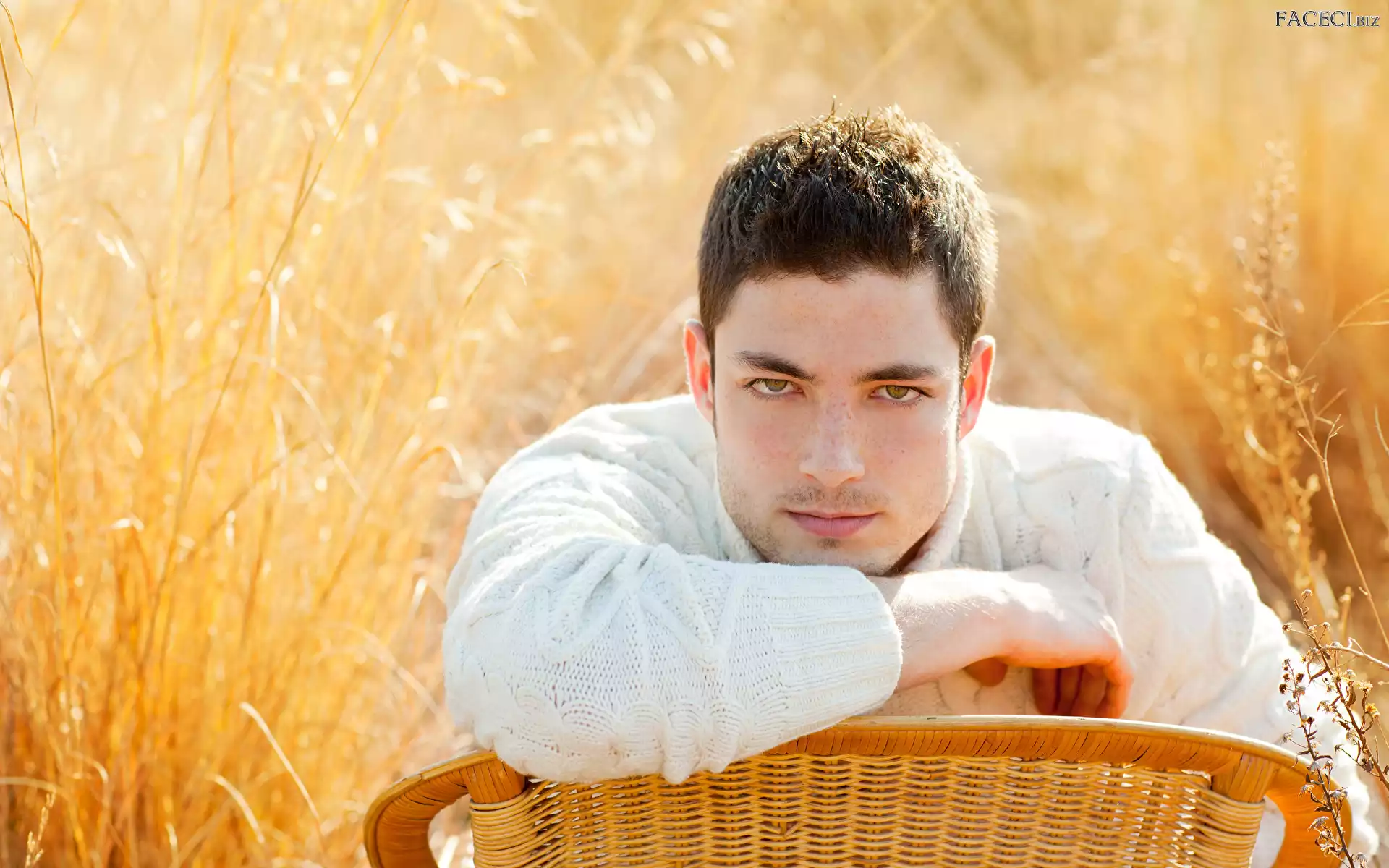 Trawa, Sweter, Mężczyzna, Krzesło, Rośliny, Biały, Wiklinowe - faceci.biz